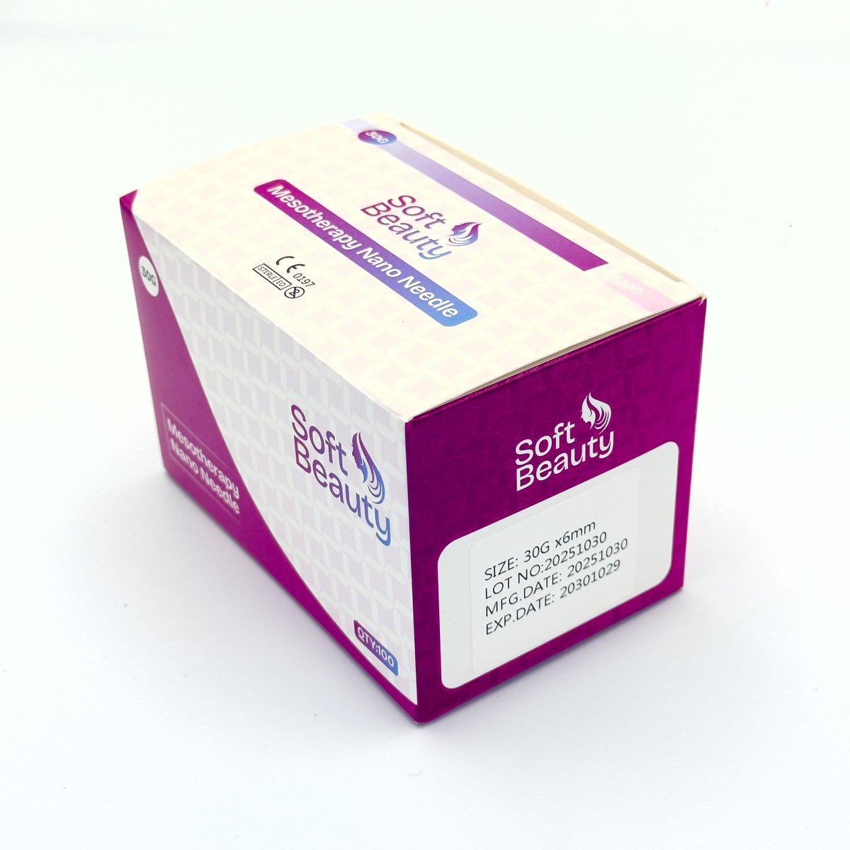 : Soft BeautySoft Beauty 30G x 6mm mesotherapy nano needles are ultra-fine, disposable hypodermic needles used in dermatological and aesthetic procedures to deliver active ingredients into the superficial to middle layers of the skin with minimal patient discomfort. in a pack of 100 sterile, individually blister-packed units. Gauge (30G): The high gauge indicates an extremely fine diameter (approx. 0.30 mm), which helps to minimize pain and tissue damage during injection. Length (6mm): The short length ensures injections remain relatively shallow, targeting the dermis or upper subcutaneous layer, essential for controlled mesotherapy and superficial filler treatments. Material: Generally made from high-grade AISI 304 stainless steel. Design: They feature sharp, multi-sharpened lancet points for smooth penetration and often a thin-walled construction to allow for a seamless fluid delivery with less extrusion force. Compatibility: Designed with a luer- connector or hub to fit standard Luer slip and Luer lock syringes and multi-injectors.Safety & Hygiene: Each needle is sterile (typically sterilized with ethylene oxide) and individually packaged in a medical-grade blister pack for single use, ensuring hygiene and reducing the risk of cross-contamination. Mesotherapy: The primary use is for injecting customized cocktails of vitamins, minerals, hyaluronic acid, and plant extracts into the mesoderm (middle layer of the skin) for skin rejuvenation and hydration. Skin Boosters: Ideal for treatments involving skin boosters to improve texture, tone, and elasticity, as their fine gauge allows precise delivery into the superficial dermis. Botulinum Toxin Injections: The ultra-fine size is perfect for precise and controlled injections of botulinum toxin (e.g., Botox) for fine lines and wrinkle reduction. Hair Restoration: Can be used for delivering growth factors and nutrients into the scalp to stimulate hair follicles and treat hair loss. Pre-procedure Anesthesia: Used to numb areas with local anesthetics prior to more invasive procedures like laser treatments or deeper micro needling to enhance patient comfortAcne Scars and Hyperpigmentation: Can be used in treatments targeting specific skin concerns like acne scars and dark spots by delivering therapeutic agents directly to the affected area. Soft Beauty needles are ISO,CE,FDA Approved PACK OF -100 STERILE NEEDLES