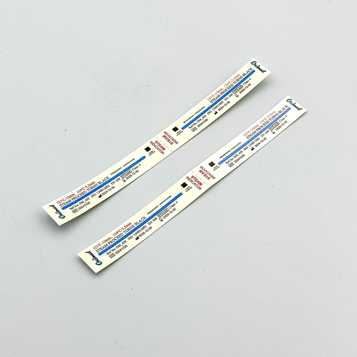 : OximedClass 4 steam indicator strips are multi-parameter chemical indicators used to monitor sterilization processes (e.g., for 15 mins or for 3.5 mins). They provide visual confirmation of proper steam, time, and temperature exposure by changing color, usually from blue/yellow to black, ensuring internal pack, tray, or container sterility. Common Uses Internal Pack Monitoring: Placed inside every pouch, cassette, or tray to confirm steam penetration. Sterilizer Types: Compatible with both gravity and vacuum-assisted steam sterilizers. Settings: Used in dental clinics, hospitals, pet hospitals, and laboratories. Efficiency Verification: Used to confirm the effectiveness of sterilization and ensure the safety of the instruments before use. PACKING -500PCS/BOX CLASS- 4