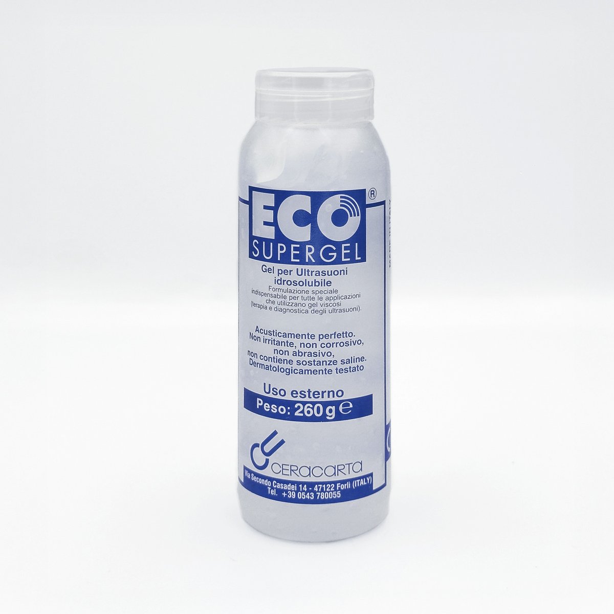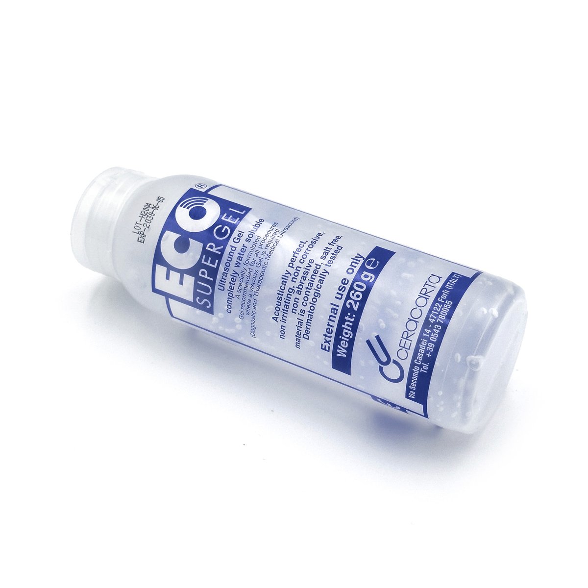 : Eco Super GelThe ultrasound Gel 260 Eco Super Gel is a high-viscosity, water-soluble, and salt-free conductive gel designed for use with ultrasound and IPL equipment to ensure optimal signal transmission. Ideal for ultrasound diagnostics, physiotherapy, and in some formulations, ECG/EEG applications.Dermatologically tested, hypoallergenic, and non-irritating to the skin. Made In Italy
