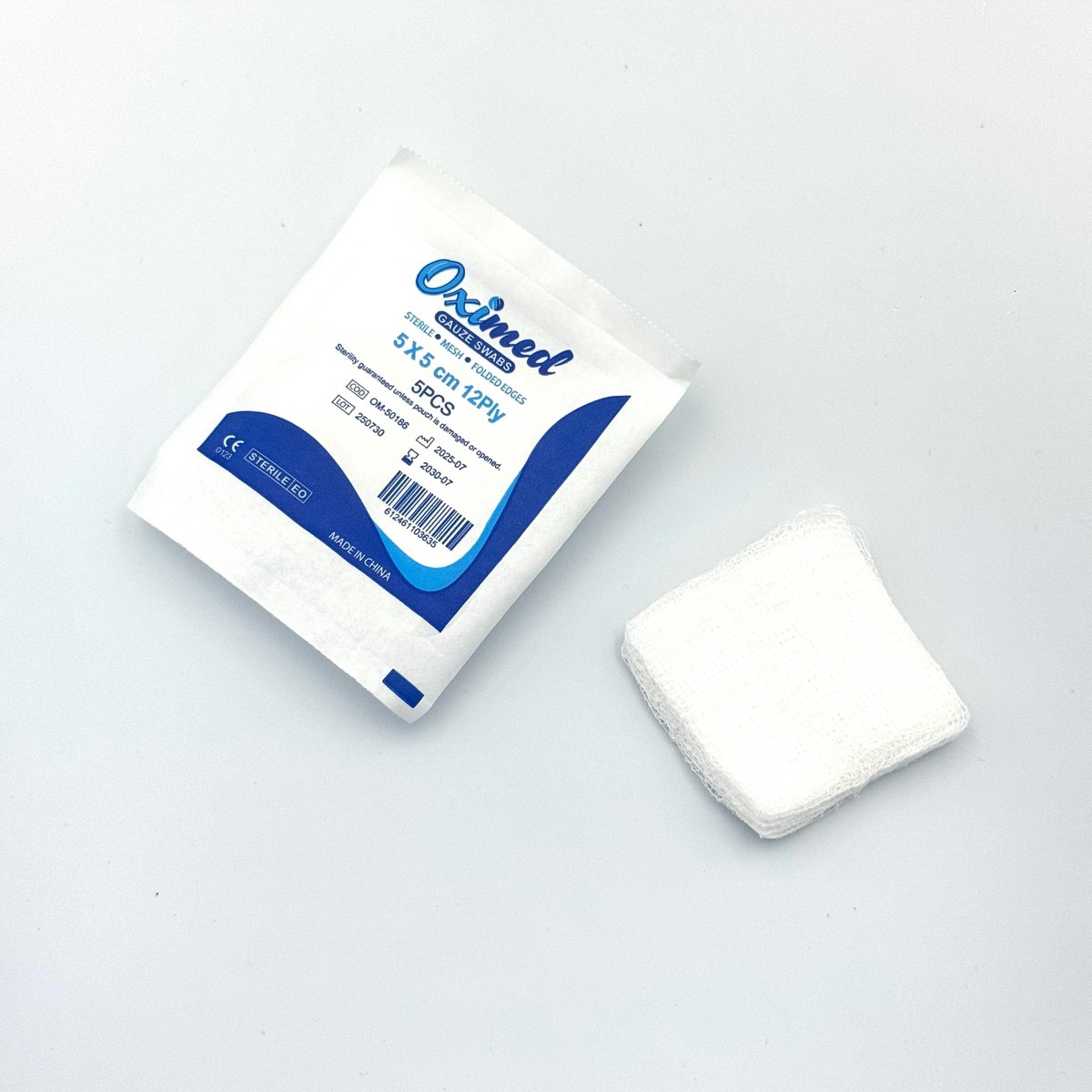 : OximedThe gauze swabs are 12 Ply in thickness and are soft, strong and highly absorbent. They are designed for use during non-invasive procedures. For example skin cleansing, wound padding and protection, absorbing blood and exudate, secondary wound dressings, etc. • Features: 100% Cotton, Highly absorbent. Size: 5cm x 5cm • Ply : 12 • Sterility: Sterile. Packed as 5 swabs/pouch. • Color: White • Single Use. • Pcs/Unit: 100 (5×20 Pouch) Highly absorbent 100% cotton pads designed for clinical, surgical, and first-aid use to clean, pack, and dress wound.