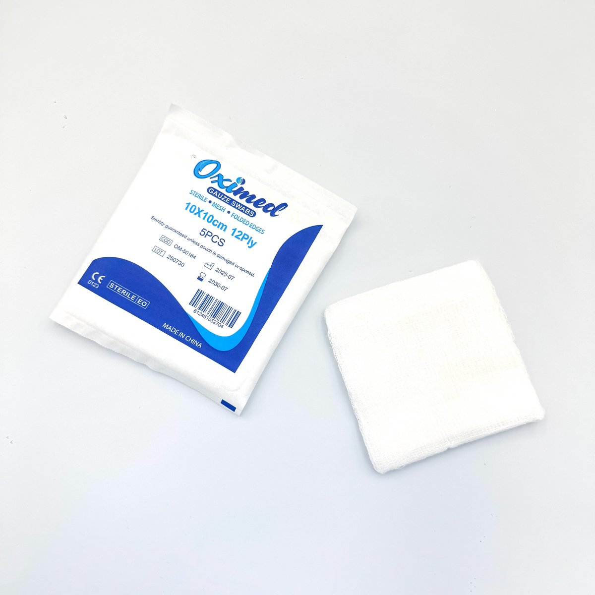 : OximedThe gauze swabs are 12ply in thickness and are soft, strong and highly absorbent. They are designed for use during non-invasive procedures. For example skin cleansing, wound padding and protection, absorbing blood and exudate, secondary wound dressings, etc. 100% Cotton Highly absorbant Size: 10 cm x 10 cm • Ply : 12 • Sterility: Sterile. Packed as 5 swabs/pouch. • Color: White • Single Use. • Pcs/Unit: 100 (5×20 Pouch) Medical Procedures: Utilized in hospitals and clinics for non-invasive, sterile, and hygienic procedures.