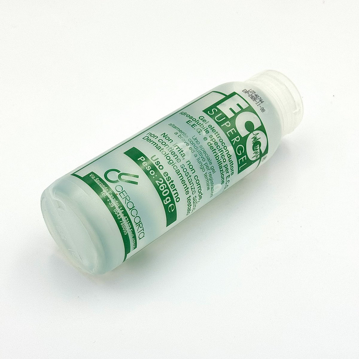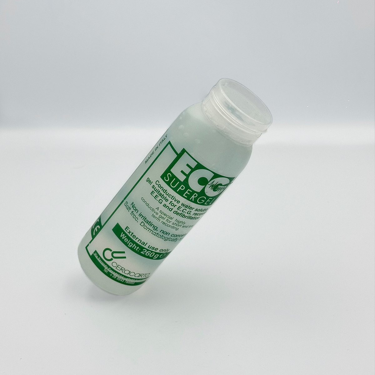 : Eco Super GelECO SuperGel (260g bottle) is an electrically conductive, water-soluble, and salt-free gel used during electrocardiography (ECG), electroencephalography (EEG), and sometimes ultrasound procedures to ensure accurate signal transmissionConductivity: It is an electrically conductive gel that creates a stable and efficient connection between the skin and electrodes to ensure accurate and reliable signal transmission from the body to diagnostic equipment. Composition: The gel has a water-based, salt-free, and non-greasy formula, which means it does not damage electrodes or probes and is easy to clean after use. Skin-Friendly: It is formulated to be hypoallergenic, non-irritating, and bacteriostatic, making it safe for use even on delicate skin types. It is also latex and PVC free. Viscosity: It has an optimal, medium viscosity which allows for easy application and spreading without dripping, making it economical to use. Appearance: The gel is typically transparent clear