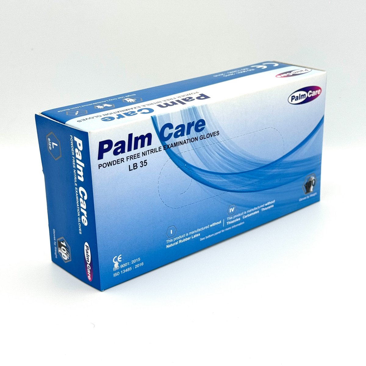 : Palm CarePalm Care Large Nitrile Powder-Free Disposable Gloves (100 pack) offer high-quality, durable, and puncture-resistant hand protection, ideal for medical examinations, labs, and food handling. These blue, ambidextrous gloves feature textured fingertips for improved grip and a beaded cuff for easy donning. Latex-free, they ensure comfort for sensitive skin. Key Features and Specifications: Material: High-quality synthetic nitrile rubber, providing superior chemical and puncture resistance compared to latex. Size: Large, designed for a comfortable, snug, and flexible fit. Design: Powder-free to prevent messy residue and reduce contamination risks, making them suitable for food service and sensitive, sterile environments. Grip & Texture: Textured fingertips enhance precision and dexterity for detailed tasks. Safety: Latex-free (allergy-safe), durable with strong tensile strength, and often CE certified. Quantity: available in packs of 100. Usage: Suitable for medical, dental, janitorial, laboratory, and household applications.