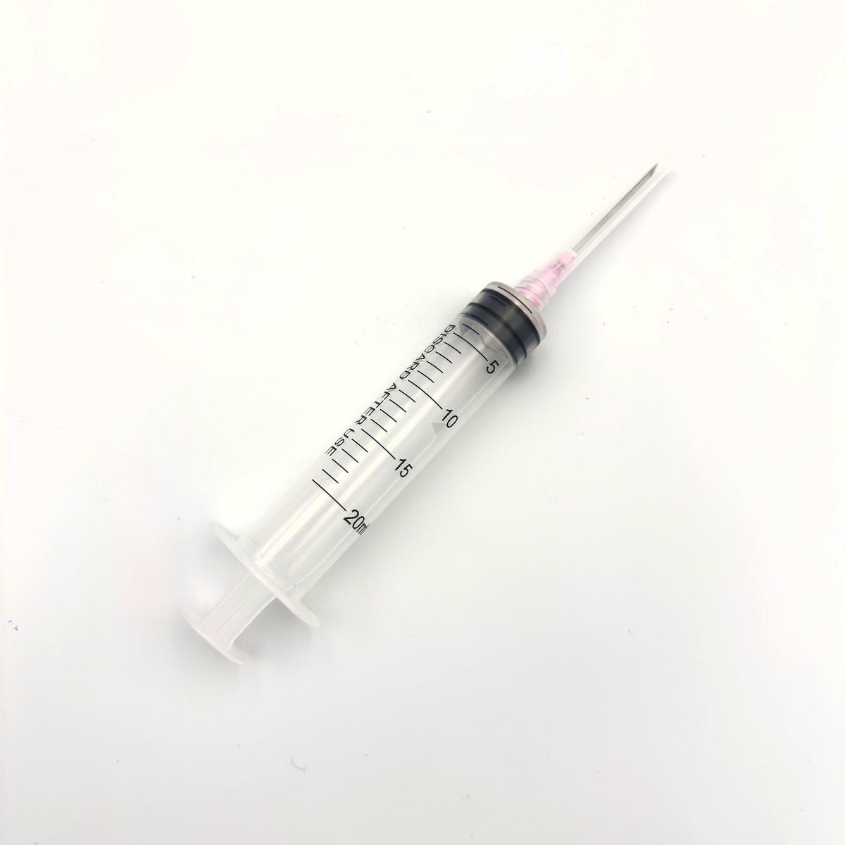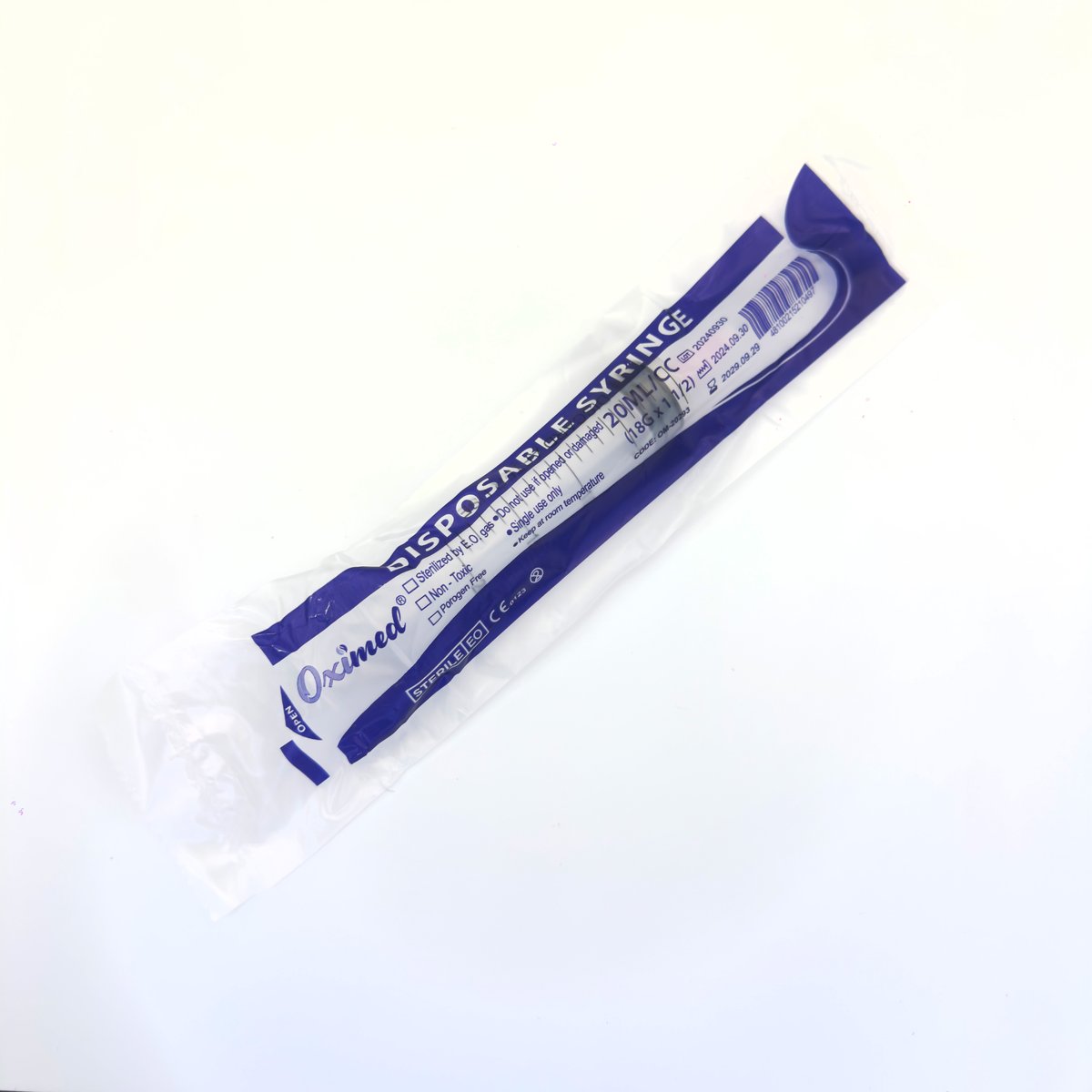 : OximedThe product is a box of 50 sterile, single-use, 20 mL disposable syringes with an attached 18G x 1 1/2" luer lock needle, designed for a secure, leak-proof connection and precise fluid handling. Key Features Volume: 20 mL (or 20cc) capacity, ideal for procedures requiring larger fluid volumes. Needle: Includes an attached 18G x 1 1/2" (18 gauge, 1.5 inch length) needle, suitable for rapid infusions, aspirations, or large-volume injections. Needle Connection: Features a secure luer lock tip system that ensures a reliable, leak-free connection between the syringe barrel and the needle hub, minimizing the risk of accidental detachment. Sterility: Each syringe is individually wrapped in a sterile, tamper-proof blister pack to prevent contamination and ensure hygiene. Sterilized by Ethylene Oxide (EO) gas. Material: Made from high-quality, non-toxic, pyrogen-free, medical-grade plastic (typically polypropylene) and is not made with natural rubber latex, reducing the risk of allergic reactions.