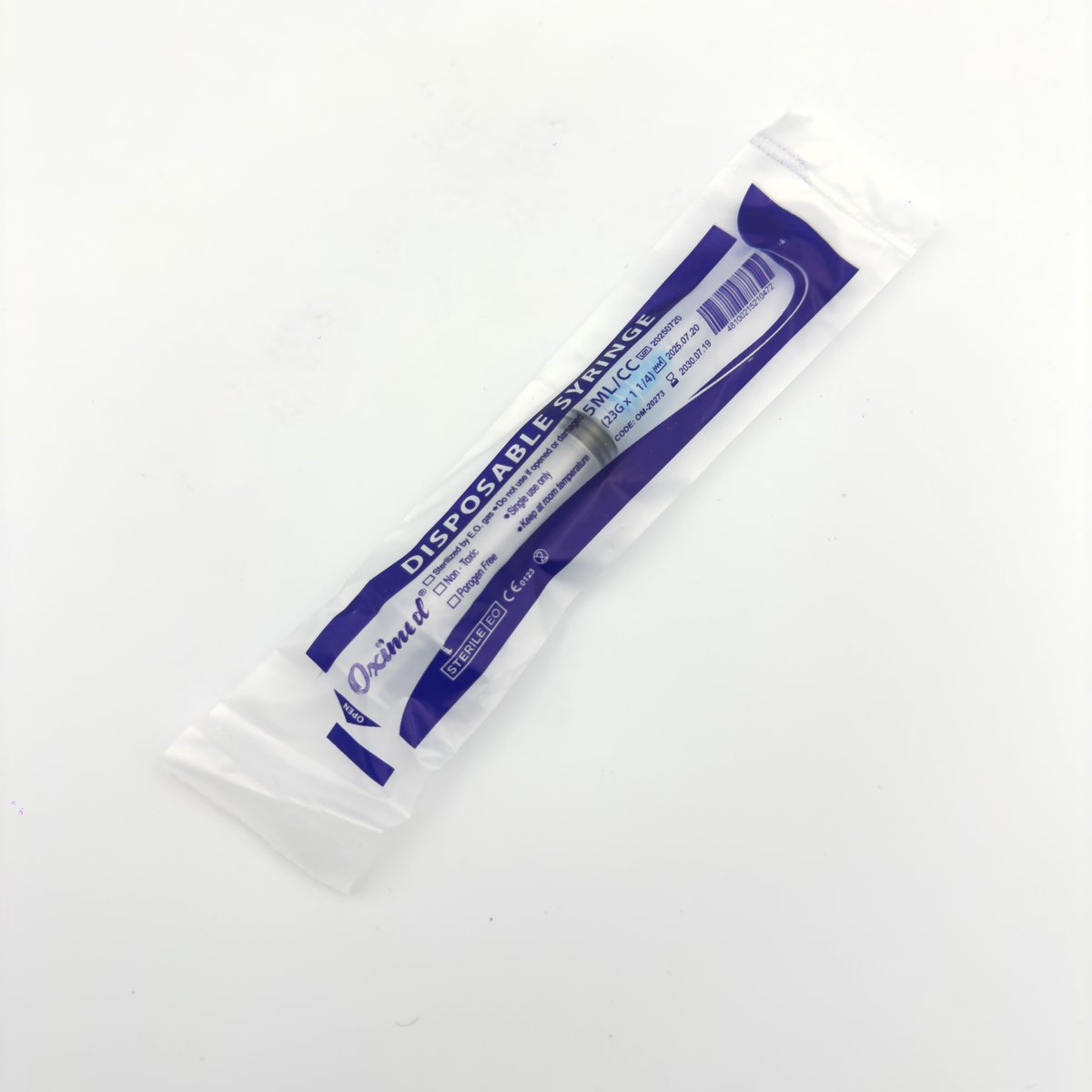 : OximedThis product description outlines a standard 5mL, sterile, single-use, 3-part medical syringe equipped with a Luer lock tip and a 23G x 1 ¼” (0.60 x 32mm) hypodermic needle. They are commonly used in medical and veterinary settings for, or in, precision injections and liquid dispensing. Key Features & Specifications: Capacity: 5ml / 5cc. Connection: Luer Lock (threaded tip to securely twist/lock the needle, preventing dislodgement and leakage). Needle: 23 Gauge (23G) x 1-1/4 Inch (1.25") stainless steel needle included. Sterility: Sterile, non-toxic, and non-pyrogenic. Quantity: Box of 100 pieces (100 PCS / BOX).Package: Individually sealed, blister/paper, or plastic package (depending on brand). Design: Transparent barrel with bold, clear, and accurate graduation markings for easy volume measurement. Plunger: Smooth, easy-glide plunger for controlled, one-handed operation. Material: Medical-grade, typically latex-free polypropylene (non-allergic).
