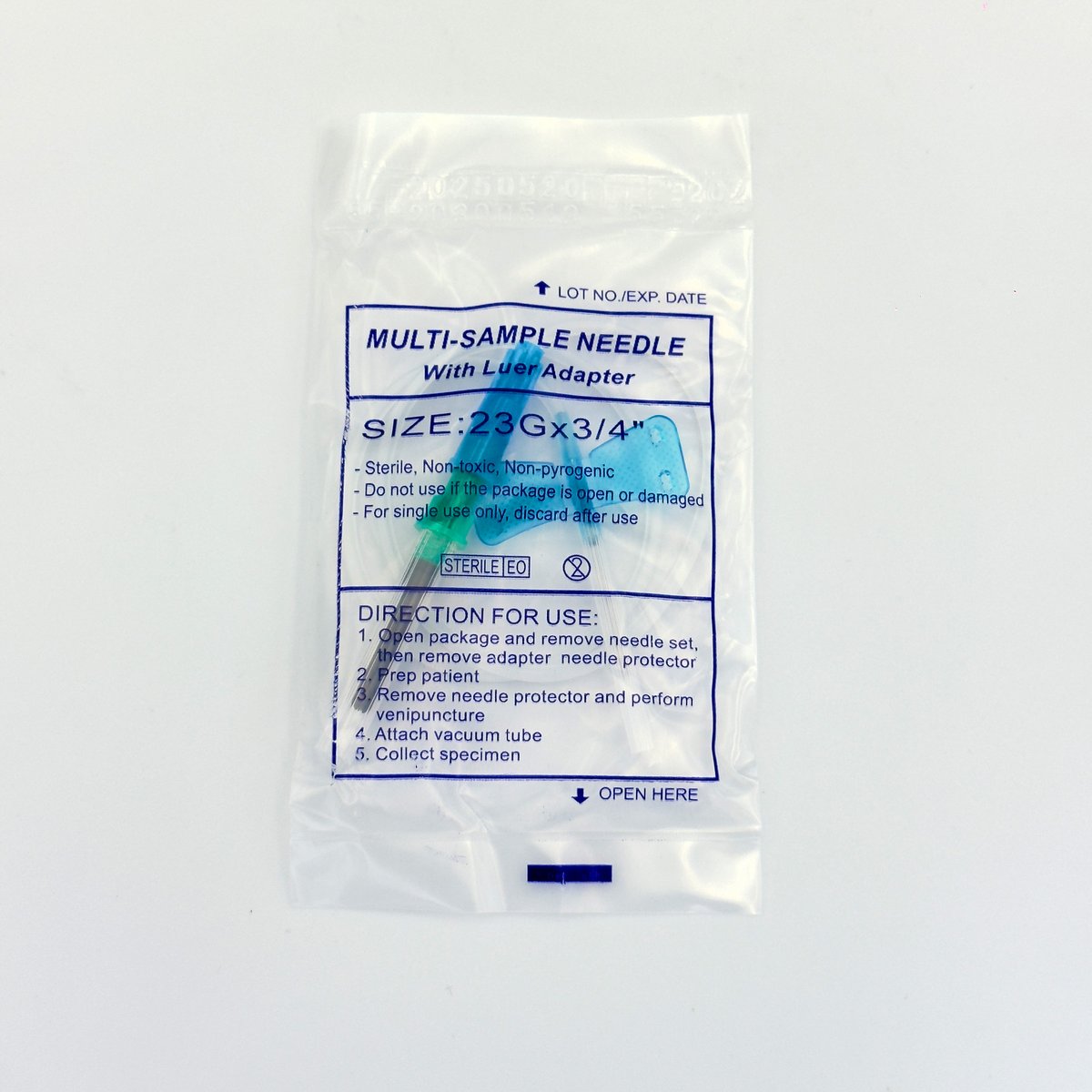 : BrandA blood collection set with luer adapter (also known as a multisample needle with luer adapter or butterfly needle set) is a sterile, single-use medical device used for phlebotomy, especially for patients with delicate or small veins. The 23G x 3/4" needle is color-coded light blue and is packaged in a box of 100 units. Key Features and Specifications The device typically includes a winged needle, flexible tubing, and a luer adapter for attaching to an evacuated tube holder (holder may be sold separately). Needle Gauge: 23 Gauge (G), which has a small diameter suitable for patients with fragile or thin veins, such as infants, young children, or some adults. The color code for 23G is typically light blue. Needle Length: 3/4 inch (0.75"). Tubing Length: Typically 12 inches (some variations might have 7 inches), providing flexibility and ease of manipulation during the procedure.Adapter: Features a luer adapter (or multi-sample luer adapter) which allows for the collection of multiple blood samples with a single venipuncture by facilitating secure connection to various vacuum blood collection tubes. Safety Mechanism: Many modern sets include a safety feature (e.g., a sliding shield or push-button retraction) that can be activated immediately after use to cover the exposed needle and help prevent accidental needlestick injuries. Material: Made from high-quality, siliconized stainless steel cannula and is typically latex-free and DEHP-free, ensuring safe use for patients and practitioners with allergies. Sterility and Packaging: The product is sterile (sterilized by ethylene oxide or gamma irradiation), non-toxic, and non-pyrogenic. Each set is typically packaged individually in a sterile pack (e.g., foil-and-paper blister pack), and the box contains 100 pieces.