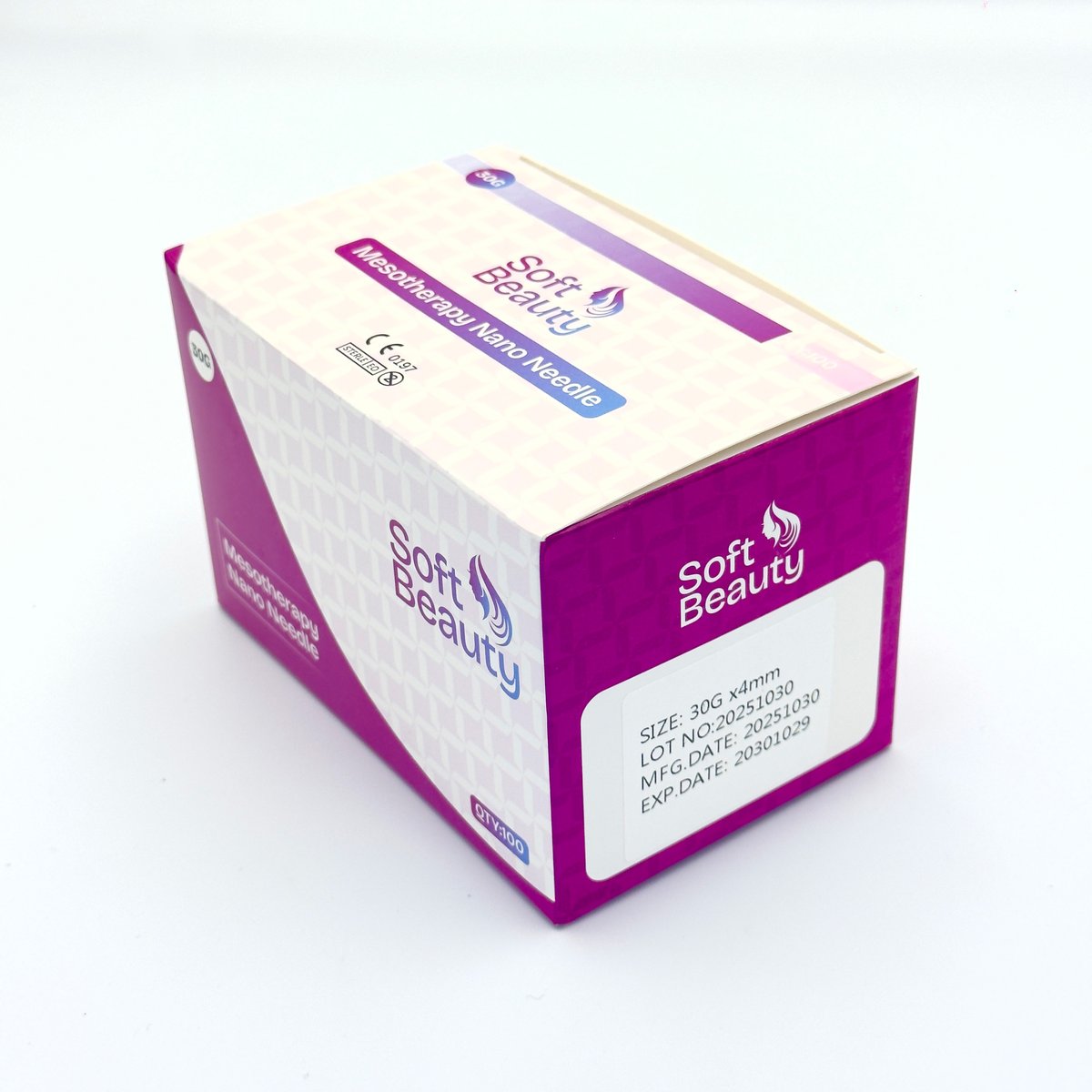 : Soft BeautySoft Beauty -30G x 4mm mesotherapy nano needles are ultra-fine, single-use hypodermic needles designed for precise, low-discomfort injections into the upper skin layers (dermis and epidermis). They come in a pack of 100 sterile, disposable needles and are compatible with standard Luer lock syringes. Gauge: 30G (Gauge), which is an ultra-fine diameter, designed to minimize patient discomfort, pain, and the risk of bruising or bleeding during injections. Length: 4mm, a short length that ensures the injection is superficial, remaining within the intradermal or subcutaneous tissue layer. Material: Typically crafted from high-quality, medical-grade stainless steel. Design: Features include an ultra-sharp, multi-facet bevel design and a light silicone coating to facilitate smooth penetration and reduce tissue trauma. Packaging: Individually blister-packed and sterilized (commonly by EO gas) to ensure hygiene and safety for a single use. These needles are specifically adapted for needle mesotherapy treatments and various cosmetic applications due to their fine gauge and short length. Mesotherapy and Skin Rejuvenation: Widely used to deliver cocktails of vitamins, minerals, hyaluronic acid, peptides, antioxidants, or Platelet-Rich Plasma (PRP) directly into the mesoderm (middle layer of the skin). This enhances the absorption of these active ingredients, which in turn improves skin hydration, tone, texture, and elasticity. Fine Line and Wrinkle Treatment: The precision of the 30G 4mm needle makes it ideal for delicate areas like the face, neck, and décolletage, effectively targeting fine lines and reducing moderate-depth wrinkles. Targeted Injections: Botox and Collagen Injections: Used for precise delivery of injectables like Botox, collagen, and local anesthetics with minimal pain.Hair Restoration: Applied in scalp mesotherapy to deliver growth factors and nutrients to hair follicles, stimulating growth and strengthening hair. Dark Circles and Pigmentation: Can be used to improve under-eye texture and lighten pigment spots with delicate injections. Scar Reduction: Helps in diminishing the appearance of scars, including acne scars. Injection Techniques: The 4mm length is suitable for the multiple superficial injections at a 45-degree angle) and the Point-By-Point technique (single injections spaced 1-2 cm apart). Soft Beauty needles are ISO,CE,FDA Approved pack of -100 's sterile needles