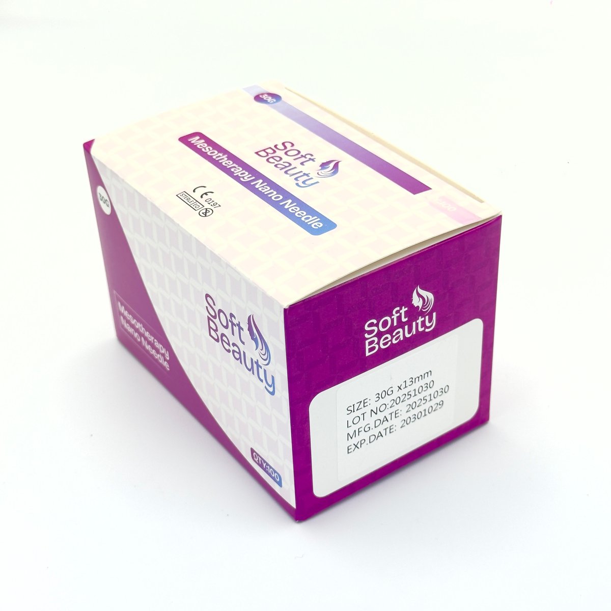 : Soft BeautySoft Beauty Mesotherapy needles of size 30G x 13mm /30Gx1/2" (gauge x length) are sterile, single-use, ultra-fine hypodermic needles used in cosmetic procedures to deliver active ingredients into the superficial and middle layers of the skin with minimal pain and tissue trauma. The high gauge (30G) indicates a very thin needle, which is a key feature for patient comfort during delicate treatmentsGauge (30G): The gauge refers to the needle's diameter or thickness; a higher number indicates a finer needle. The 30G is an ultra-fine gauge (approximately 0.30mm diameter) designed to minimize pain, bleeding, and bruising during injections, which often eliminates the need for local anesthesia. Length (13mm or 1/2 inch): This length allows for injections into various depths of the skin, including the dermis and subcutaneous tissue, making them versatile for a range of treatments. Shorter needles are typically preferred for superficial treatments, while longer ones are used for deeper injections like fat dissolution in body areas. Material: The needles are made from high-grade, surgical-grade stainless steel to ensure strength, reliability, and hygiene. Design Features: They feature a sharp, often multi-bevel or lancet point cut, which allows for smooth penetration and reduces tissue damage. They also have thin walls to facilitate smoother injection with less extrusion force.Facial Rejuvenation and Skin Boosting: Used to inject revitalizing "cocktails" of vitamins, minerals, amino acids, antioxidants, and hyaluronic acid into the middle layer of the skin (mesoderm) to improve hydration, reduce fine lines, enhance glow, and stimulate collagen production. Botulinum Toxin (Botox) Injections: The fine gauge and controlled length make them ideal for precise delivery of botulinum toxin into specific facial muscles. Hair Restoration: Injected into the scalp to deliver hair growth vitamins, peptides, and Platelet-Rich Plasma (PRP) to stimulate hair follicles and treat hair loss. Soft Beauty needles are ISO,CE,FDA Approved box -100 pcs individual sterile Needles .