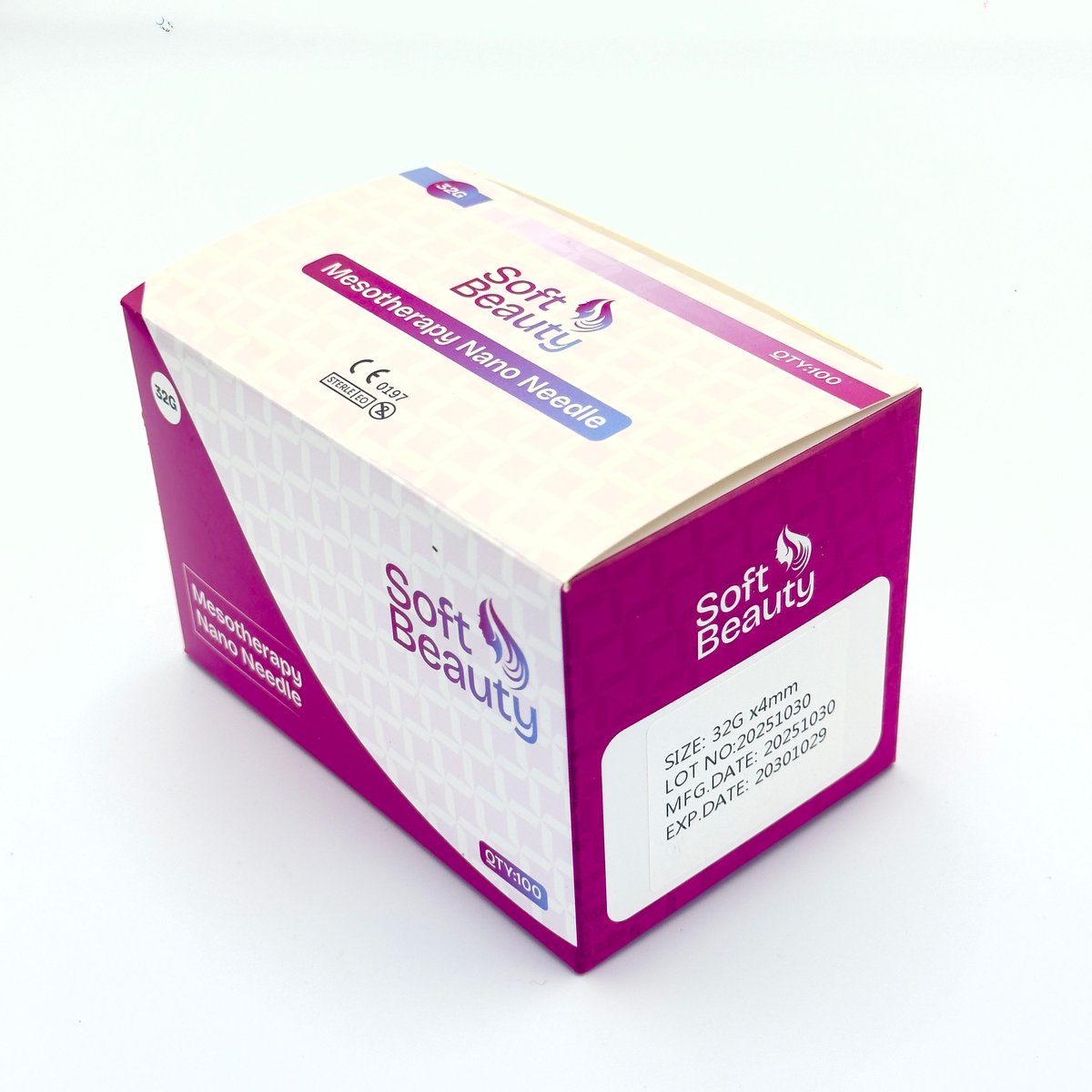 : Soft BeautySoft Beauty 32G x 4mm mesotherapy needles are ultra-fine, short, disposable hypodermic needles designed for precise and comfortable injections into the superficial layers of the skin. They are primarily used in professional aesthetic and medical treatments. Gauge: 32G (Gauge), which is an ultra-fine diameter of approximately 0.23 mm, designed to minimize patient discomfort and trauma during penetration. A higher gauge number indicates a finer needle. Length: 4mm (millimeters), a short length ideal for controlled, shallow injections into the mesoderm (middle layer of skin) or subcutaneous tissue, reducing the risk of intramuscular injection. Material: Made from high-grade, surgical-quality stainless steel. Design: They typically feature a sharp, multi-bevelled, and silicone-coated tip to ensure smooth entry and flow, minimizing pain and the risk of bruising. They often have thin walls to enable less extrusion force for smoother injection. Safety & Compatibility: They are sterile, non-toxic, non-pyrogenic, and designed for single use only to maintain hygiene standards. They feature a universal Luer-lock fitting, ensuring a secure connection to most standard syringes and mesotherapy devices.Aesthetic and Skin Treatments: Used for facial rejuvenation, improving skin texture and tone, and enhancing skin firmness. Delivery of Active Ingredients: Ideal for administering small, precise doses of substances such as vitamins, minerals, hyaluronic acid, peptides, and specialized "meso cocktails". Targeted Concerns: Effective for reducing fine lines and wrinkles, managing hyperpigmentation, treating acne scars, and addressing cellulite or stretch marks.Sensitive Areas: The ultra-fine and short design makes them particularly suited for delicate and sensitive areas like the face (including around the eyes and lips), neck, .Soft Beauty needles are ISO,CE,FDA Approved ,Pack -100 /BOX.