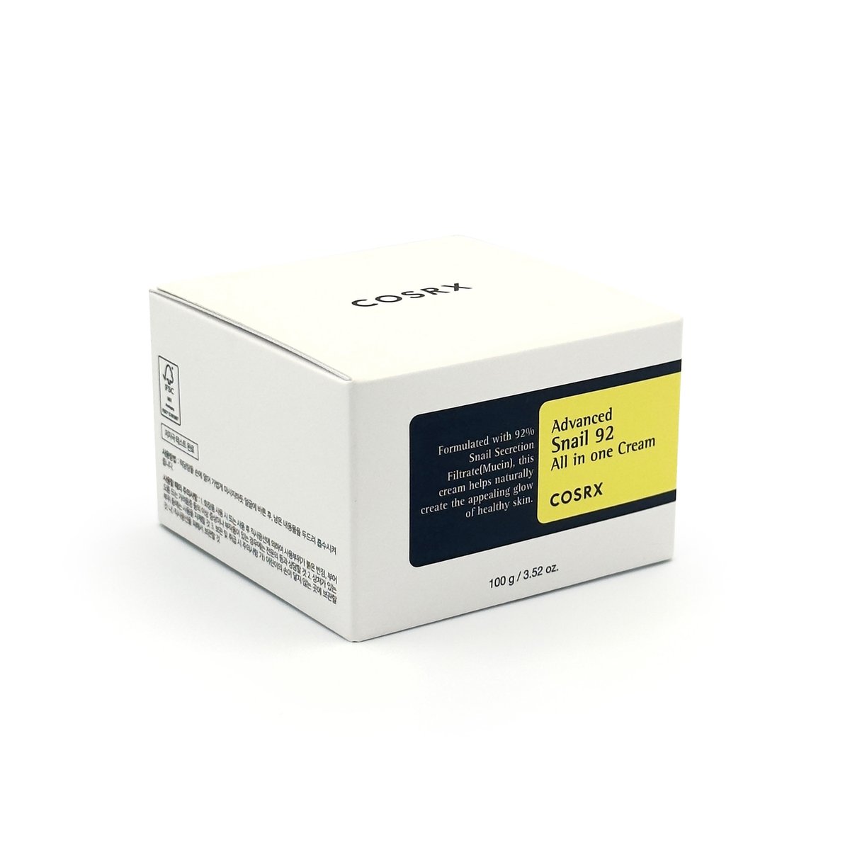 : COSRX - MADE IN KOREACOSRX was founded in 2013 as a small Korean skincare brand with a handful of products and big goals. By 2014, COSRX's products were making significant online ripples among the international skincare community with customers reporting fantastic tangible results. Unlike the traditional Korean brands, Cosrx is ingredient focused and uses minimal yet effective ingredients without unnecessary fillers in their products. Cosrx is generally termed as a clean beauty brand as it is believed to contain only safe ingredients.Cosrx Advanced Snail 92 All In One Cream 100ml is a lightweight, gel-type moisturizer formulated with 92% snail secretion filtrate to deeply hydrate, repair, and soothe skin without greasiness. It enhances elasticity, reduces redness, and fades acne scars for a glowing, "glass skin" finish, making it suitable for all skin types, especially sensitive or dry skin. Key Ingredient: 92% Snail Secretion Filtrate for intense nourishment, skin regeneration, and barrier repair. Texture: Light-weight, non-greasy, gel-type cream that absorbs quickly. Formula Highlights: Free from artificial colorants and fragrances. Primary Benefits: Provides deep moisture, improves elasticity, and calms irritated skin. How to Use: After cleansing and toning, apply a moderate amount onto the face and neck, tapping gently for better absorption. Best Time: Suitable for both morning and evening,, as a final step to lock in moisture. Skin Types: Ideal for all skin types, particularly those with dry, damaged, or sensitive skin. Tip: Can be used on damp skin to maximize hydration. Benefits Hydration & Repair: Replenishes moisture and repairs the skin barrier. Anti-Aging: Helps diminish the appearance of fine lines and wrinkles. Soothing: Calms irritation and reduces redness after breakouts. Even Tone: Helps lighten acne scars and dark spots. Disclaimer No Professional Advice: The information is not intended as a substitute for professional medical advice, diagnosis, or treatment. Always seek the advice of your physician, pharmacist, or another qualified healthcare provider with any questions you may have regarding a medical condition or product use, especially if you have sensitive or acne-prone skin. .Country of Origin South Korea Form Cream Skin Type Dry.We source our products directly from trusted brands and authorized distributors. They are carefully stored and shipped from our certified climate-controlled warehouses. To guarantee authenticity, we do not permit third-party resellers on our website .
