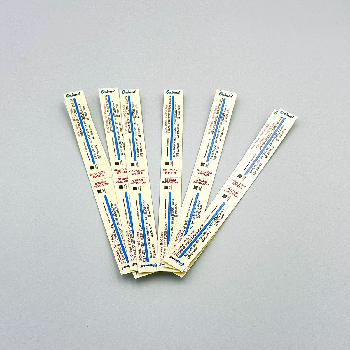 : OximedClass 4 steam indicator strips are multi-parameter chemical indicators used to monitor sterilization processes (e.g., for 15 mins or for 3.5 mins). They provide visual confirmation of proper steam, time, and temperature exposure by changing color, usually from blue/yellow to black, ensuring internal pack, tray, or container sterility. Common Uses Internal Pack Monitoring: Placed inside every pouch, cassette, or tray to confirm steam penetration. Sterilizer Types: Compatible with both gravity and vacuum-assisted steam sterilizers. Settings: Used in dental clinics, hospitals, pet hospitals, and laboratories. Efficiency Verification: Used to confirm the effectiveness of sterilization and ensure the safety of the instruments before use. PACKING -500PCS/BOX CLASS- 4