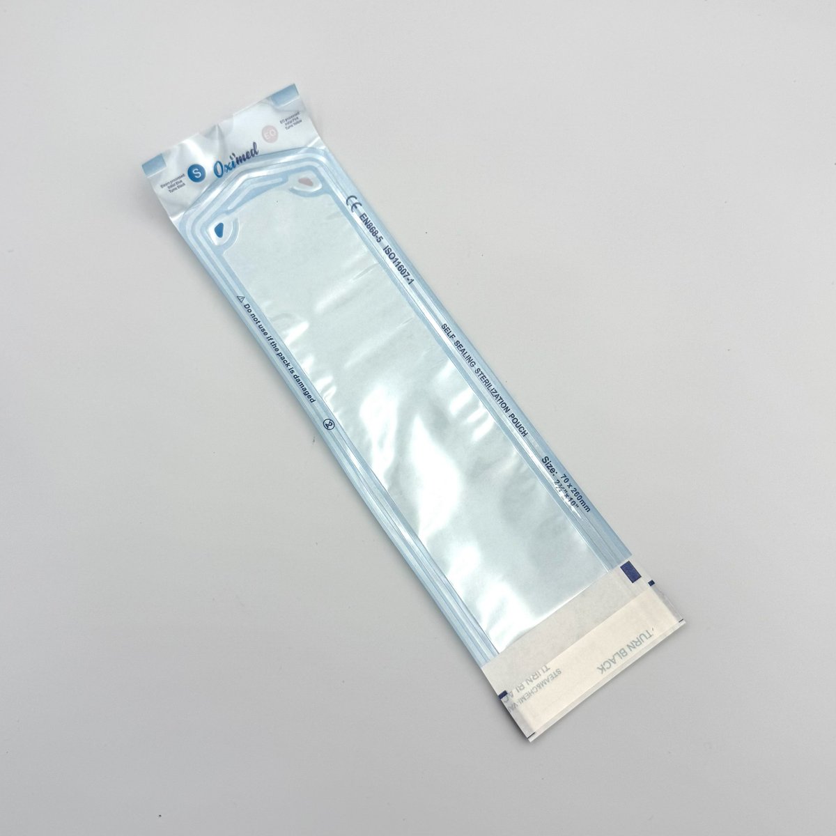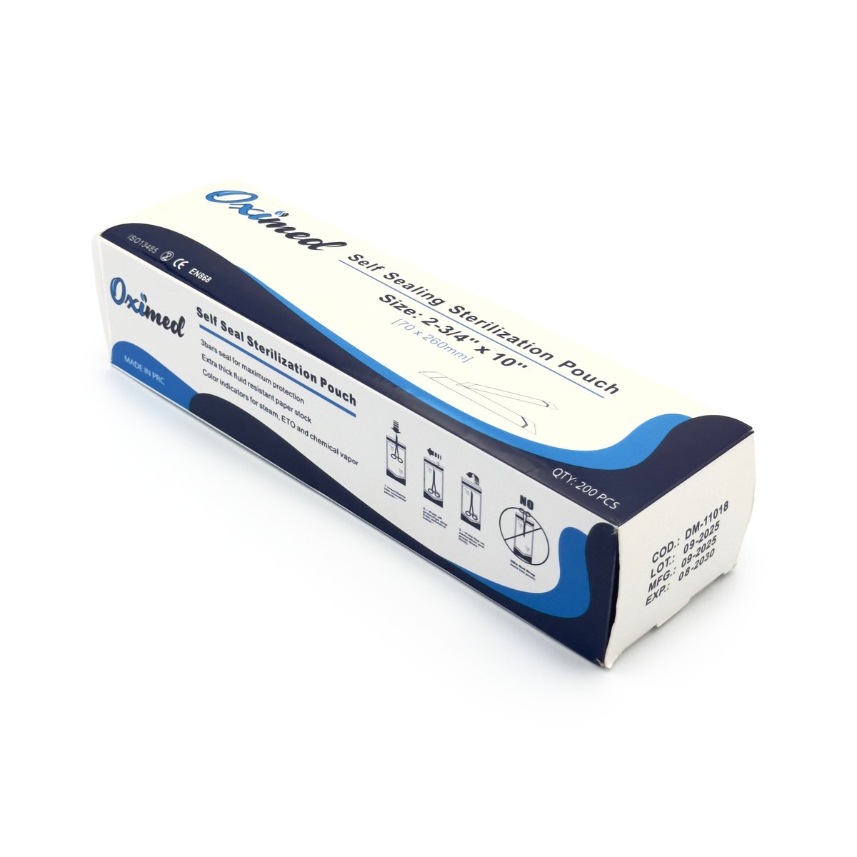 : OximedA 70x260 mm 2-3/4"X 10" Self-sealing sterilization pouch is a medical-grade, disposable package used to sterilize and store instruments in autoclaves (steam) or ethylene oxide (EO) methods. It features a paper-plastic, heat-sealed, and self-adhesive design with color-changing indicators, making it ideal for dental, medical, and cosmetic tools.Dimensions: Material: Constructed with medical-grade paper and a multi-ply transparent blue-tinted PET/PP film. Self-Sealing: Features a pre-folded, adhesive strip for secure, quick closing without external machinery. Indicators: Includes built-in, non-toxic, water-based chemical indicators for steam and/or EO, showing a color change to verify sterilization. Safety & Design: Three-side, explosion-proof, and heat-sealed edges prevent bursting, while the transparent film ensures easy tool identification. Usage: Suitable for autoclaves, providing a sterile, tear-free, and fiber-free experience upon opening PACKING -200/BOX