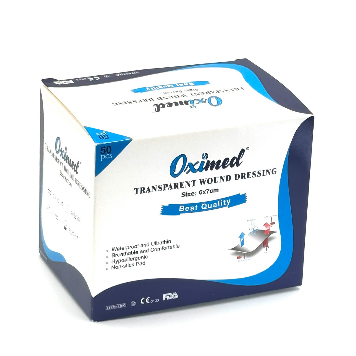 : OximedA sterile, self-adhesive, and waterproof wound cover that provides a protective barrier against external contaminants like water, dirt, and germs. Its transparency allows for easy monitoring of the wound without removing the dressing, and the built-in absorbent pad manages light to moderate exudate. Used to cover and protect surgical incisions, providing a sterile barrier while allowing easy visual inspection of the healing site.
