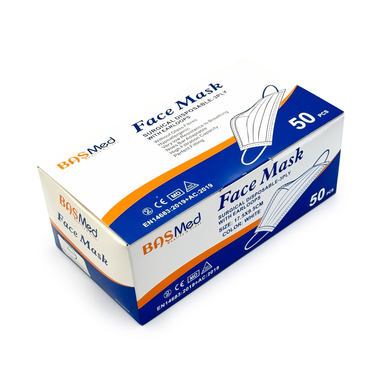 : BasmedWHITE disposable face masks with ear loops are 3-ply, non-woven protective coverings featuring a White outer layer, a melt-blown filter layer, and a soft, skin-friendly inner layer. They include elastic, stretchy ear loops and an adjustable nose clip for a secure, comfortable fit, commonly used for daily, non-surgical protection. High-elastic, soft, and round or flat ear bands that reduce pressure on the ears for long-term wear.Disposable, Comfort: Lightweight, breathable, and designed to minimize skin irritation. Specifications: Material: Non-woven fabric, white Layers: 3-ply-masks designed for personal, daily protection in public, offices, or schoolSize: Generally one-size-fits-most for adults. Packaging: available in boxes of 50 pieces.