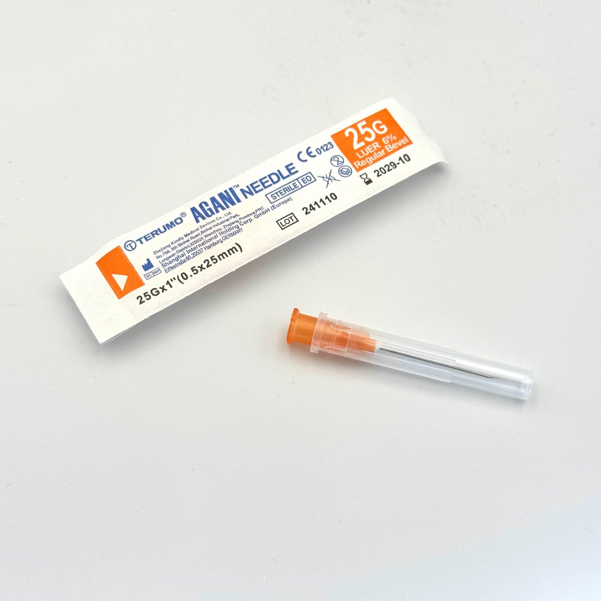 : TerumoThe Terumo Agani™ Needle 25G x 1" (0.5 x 25mm, Orange Hub) is a high-quality, sterile, single-use hypodermic needle designed for precision, patient comfort, and smooth, consistent injection performance. Known for its ultra-sharp, silicone-coated, double-bevel lancet tip, this needle minimizes tissue trauma and reduces injection pain. Gauge/Size: 25G (0.5mm diameter). Length: 1 inch (25mm). Color-Code: Orange (ISO 6009 standard for easy identification). Design: Thin-walled construction allowing higher fluid flow rates while maintaining structural integrity. Coating: Silicone lubricant coating on the cannula ensures a smooth, gliding insertion. Safety: Individually packaged in tamper-evident blister packs, sterile, and latex-free. Compatibility: Fits standard Luer and Luer Lock syringe tips.