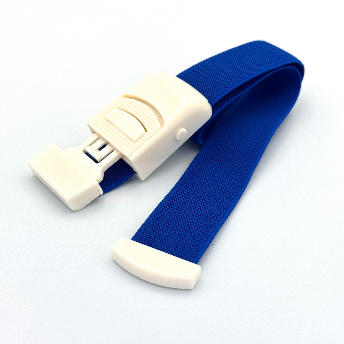 : BrandA blue, reusable, adult-sized tourniquet is a common, durable medical device used primarily for phlebotomy, blood sampling, and intravenous (IV) procedures to temporarily restrict venous blood flow. In dermatology, it is used to identify suitable veins for intravenous drug administration (e.g., in sclerotherapy or infusion therapy) or for blood collection. Material: Usually made from a high-quality, durable elasticated fabric or elastomer knit, designed to be soft against the skin. Design: Features a plastic, quick-release buckle (or clip) that allows for one-handed operation and immediate, easy removal. Dimensions: Standard adult size is typically around 45 cm in length and 2.5 cm in width. Attributes: Often latex-free and hypoallergenic to accommodate patients with sensitive skin. Identification: The blue color is often used to distinguish it from other medical equipment or, in some cases, to designate it as a training device.